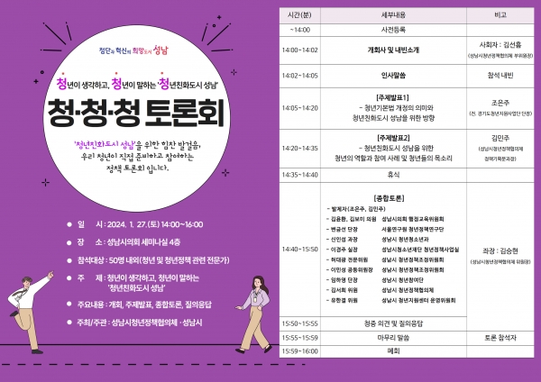 [광성일보] 성남시는 오는 1월 27일 오후 2시 시의회 4층 세미나실에서 ‘청년이 생각하고 청년이 말하는 청년친화도시 성남’을 주제로 한 토론회(청·청·청 토론회)를 개최한다.이날 토론회는 청년 친화 도시로 나가기 위한 해법을 찾기 위해 성남시 청년정책협의체가 기획·주관해 열린다.
