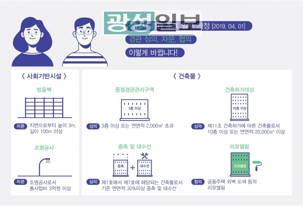 높이 3미터 이상, 길이 100미터 이상 방음벽공사와 총사업비 3억원 이상 조명공사를 심의대상에서 자문대상으로 변경하고 공동주택 외벽 도색 등의 경우 경관부서와 협의하도록 했다.