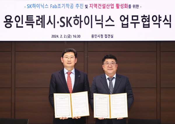 [광성일보] 용인특례시(시장 이상일)는 2일 시청에서 SK하이닉스(사장 김동섭)와 생산라인(팹, Fab) 조기 착공 추진과 지역건설산업 활성화를 위한 업무협약을 체결했다.SK하이닉스와 관련 소재·부품·장비 기업들이 글로벌 반도체 패권 경쟁에 능동적으로 대응할 수 있도록 팹 가동 시기를 최대한 앞당기기 위해서다.SK하이닉스가 120조원을 투자해 처인구 원삼면 일대에 조성 중인 용인 반도체 클러스터에는 팹 4곳과 50여개의 기업이 입주할 예정이다. 핵심 시설인 1번 팹을 2027년 상반기 가동한다는 계획에 따라 올해 건축허가를 마쳐 내년 상반기에 팹 착공을 추진할 방침이다.
