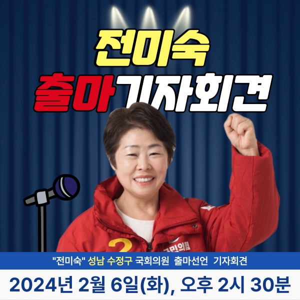저의 출마는 수정구의 미래에 대한 변함없는 애정과 무한한 책임감의 몸부림입니다. 앞으로도 여러분들의 뜨거운 지지와 협력 그리고 끊임없는 소통을 부탁드리며, 함께 빛나는 수정구의 미래를 도약하며 이뤄나가겠습니다. 시민을 대표하고 구민을 대변하는 저 전미숙이 전심전력을 다해 수정구민의 뜻을 국회와 정부로 전달하겠습니다. 우리 국민을 위한 필수 도구인 저 전미숙을 꼭 사용해주십시오. ‘정치 교체의 유일한 선택 전미숙2 반드시 하겠습니다’