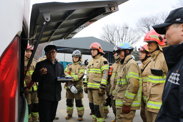 또한, 화재진압훈련 외에도 전기버스 관련업체 관계자 5명을 초청해 전기차 급속충전기 비상차단 방법과 전기버스 고전압 배터리 대응절차에 대한 현장 이론교육도 함께 진행했다.서병주 분당소방서장은 “최근 늘어나는 전기버스 보급과 차고지 내 충전시설이 증가함에 따라 유사시 상황에 맞는 현장 훈련이 절실하다”라며 “이번 훈련을 통해 분당소방서 직원들이 전기차 화재에 있어 능력을 강화하는 계기가 되었길 바란다”고 전했다.
