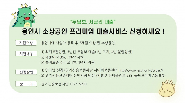 [광성일보] 용인특례시(시장 이상일)는 신용등급이 낮아 제도권 금융 이용이 어려운 영세 소상공인을 대상으로 무담보‧저금리 대출 보증을 지원키로 하고 신청자를 모집한다고 14일 밝혔다.이 사업은 경기신용보증재단의 보증을 통해 소상공인들의 창업 및 운영자금을 최대 5000만원까지 5년간 무담보로 빌릴 수 있도록 돕고 시에서 연 3% 범위 내에서 1년간 대출 이자를 지원한다.특례보증을 받기 위해 소상공인들이 부담해야 하는 보증수수료도 시가 1년간 지원해 준다.
