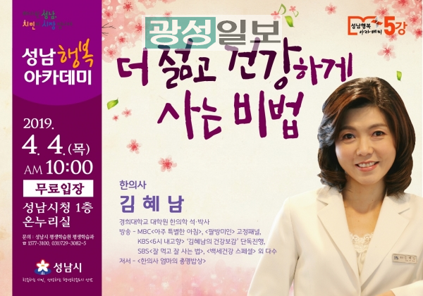 성남시(시장 은수미)는 4월 4일 오전 10시 성남시청 온누리에서 김혜남 한의사를 초빙 ‘더 젊고 건강하게 사는 법’을 주제로 올 해 다섯 번째 성남행복아카데미 강연을 연다.