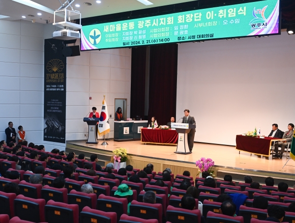 [광성일보] 새마을운동 광주시지회는 21일 광주시청 대회의실에서 제14대·15대 지회장, 시협의회장, 시부녀회장 이‧취임식을 개최했다.이번 행사는 각 단체장 및 지도자, 초청 내빈 등 250여명이 참석한 가운데 이임회장단에 대한 감사패 전달, 이임사, 취임사에 이어 격려사, 축사, 기념 촬영 순으로 진행됐다.이날 2018년부터 6년간 광주시 새마을회를 이끌어 온 박광성 회장이 이임하고 지난 2월 광주시새마을회 정기총회에서 15대 회장으로 선출된 신원영 회장이 취임, 3년간 광주시 지역사회 발전과 더불어 살아가는 사회 구현에 최선을 다할 예정이다.