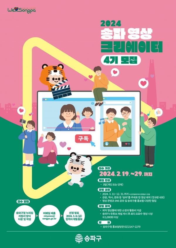 작년 최다 조회 수를 기록한 영상은 ‘절대 후회 없을 송파구 봄 여행지 BEST 4’이다. 석촌호수 벚꽃 시즌을 겨냥해 구 관광명소를 소개하면서 많은 호응을 얻었으며, ‘귀여운 견이 세상을 구한다(feat.2023 송파구 반려동물 한마당축제)’, ‘스무 살의 우당탕탕 송파구 솔플 여행기’, ‘송파구 루미나리에 축제 폼 미쳤다잉~!!!’ 등이 뒤를 이어 축제·관광 주제 영상이 강세를 드러냈음을 알 수 있다.제4기 크리에이터의 활동기간은 오는 3월 11일부터 연말까지로, 팀별 연 6편 내외의 영상을 제작하고 구정 홍보와 관련한 다양한 협업을 전개하게 된다. 제작 영상물에 대한 소정의 활동비가 지급되며, 구 주관 각종 행사 초청의 기회도 주어진다. 조회 수 2천 회 이상을 기록한 ‘최다 조회 수 영상’은 별도 시상도 있을 예정이다.영상의 기획부터, 제작, 개인 SNS 업로드까지 종횡무진 활동하며 창작한 영상 결과물은 유튜브뿐만 아니라 동 주민센터와 구청 IPTV에 송출, 구민 일상 가까이에서도 확인할 수 있을 전망이다.