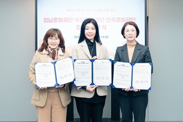 3개 재단은 이날 협약을 시작으로 앞으로 지역예술가 지원 및 전시 사업 교류, 공동사업 추진 및 홍보 등을 통해 전시 사업 활성화는 물론 지역의 문화예술 발전과 확산을 위해 함께 노력하기로 했다.특히 오는 11월, 성남아트센터 성남큐브미술관에서 진행하는 ‘지역예술가교류전’에 성남, 부산, 전주 세 도시의 작가들이 참여하고, 이후 부산과 전주에서도 교류전을 이어갈 예정이다.