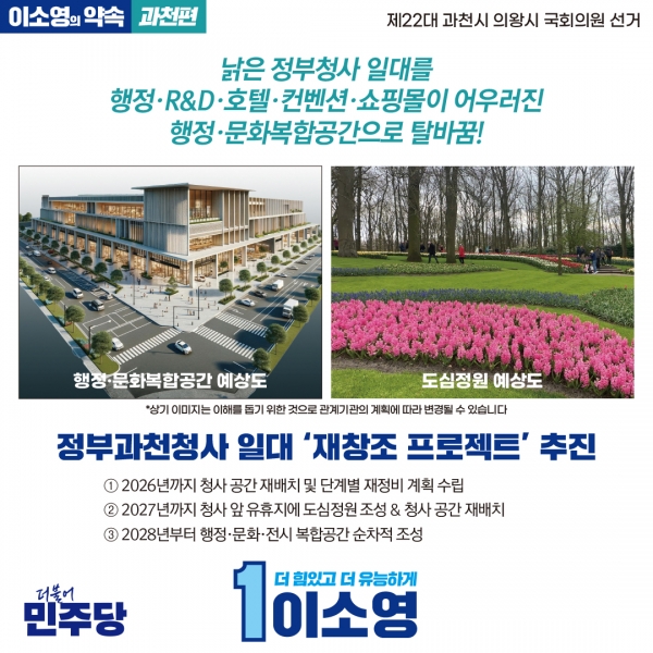 [광성일보] 더불어민주당 이소영 국회의원(경기 과천시·의왕시)이 과천시를 위한 총선 1호 공약으로 ‘정부과천청사 일대 재창조 프로젝트’를 추진하겠다고 밝혔다.노후 정부과천청사 일대 재정비를 통해 정부청사 업무공간을 효율화 및 재배치하여, 확보된 유휴부지에 행정·R&D·호텔·컨벤션·쇼핑몰이 어우러진 행정·문화복합공간을 조성하겠다는 목표다. 또한, 정부청사 앞 유휴지에 도심 속 정원 ‘플라워가든’ 조성을 추진하겠다는 계획도 내놓았다.이 의원은 “정부과천청사 내 장·차관급 기관이 4곳밖에 남지 않았는데, 윤석열 정부 들어 방사청 이전이 확정되고 방통위마저 이전 우선 검토 대상으로 지목되며 반 토막 날 위기에 처해 있다”며 “현재 상황에 대한 과천시민 여러분의 답답함과 변화를 바라는 열망을 느꼈고, 저의 1호 공약으로 이 문제의 해결책과 과천에 대한 비전을 함께 담아 보여드리고 싶었다”고 해당 공약을 첫 번째로 꼽은 이유를 설명했다.