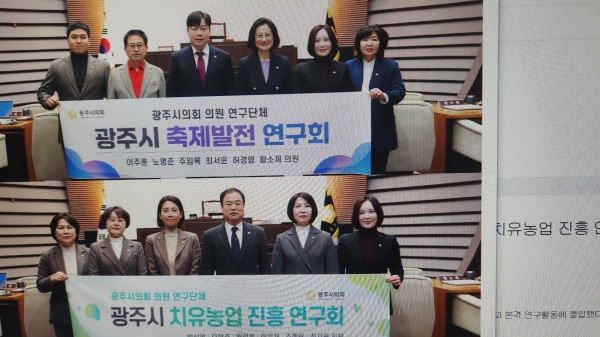 [광성일보] 광주시의회(의장 주임록)는 지난 5일 ‘광주시 축제발전 연구회’와 ‘광주시 치유농업 진흥 연구회’가 발대식을 열고 본격 연구활동에 돌입했다고 밝혔다.각 연구회는 「광주시의회 의원연구단체 구성 및 운영 조례」에 따라 조직된 의원연구단체로, 조례상 2명 이상의 의원은 시정발전 등 관심 있는 분야에 대해 연구단체를 구성하여 운영할 수 있다고 규정되어 있다.