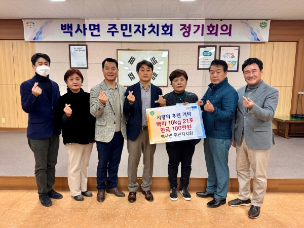 백사면 주민자치회 이호규 회장은 “뜻깊은 날 백사면의 어려운 이웃을 위해 기부하게 되어 기쁘고, 앞으로도 백사면에 도움이 되는 사회공헌 활동을 이어가겠다”고 말했다.또한 이정호 백사면장은 “지역 내 단체들의 다양한 후원과 지원으로 나눔을 실천하는 백사면이 되기를 희망한다”고 격려의 말을 전했다.