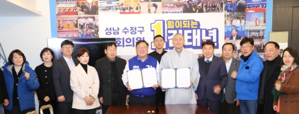 성남시고도제한범대위는 이날 최종 후보로 확정된 더불어민주당 김태년 후보와 국민의힘 장영하 후보와 만나 수정구 재개발의 걸림돌인 고도제한 완전해결에 대한 의지를 담은 정책협약식을 체결했다.이날 성남시 수정구 더불어민주당 김태년 후보는 “수정구 지역에 대해 적용되고 있는 고도제한 완전해결을 위해 대안을 갖고 있다”면서“고도제한이 완전 해결될 수 있도록 힘을 보탤 것”이라고 밝혔다.