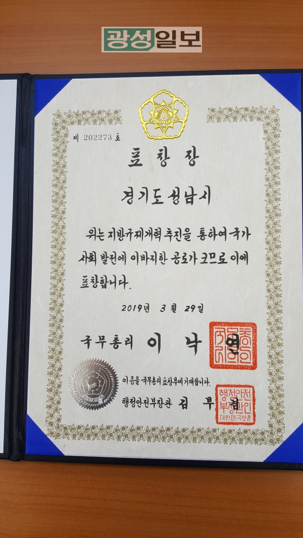 성남시는 이러한 규제혁신 사례로 지난해 연말 “지방 규제혁신 인증 기관으로” 선정되어 행안부 장관 인증패와 재정인센티브 1억원을 수상 한바 있다.