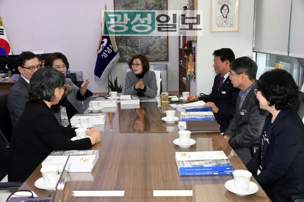은수미 성남시장과 고석주 한국빠이롯드 만년필(주)회장은 3일 오후 시청 집무실에서 성남 제1공단 부지에 남아있는 빠이롯드 공장 조사 기록에 대한 환담을 나누었다.