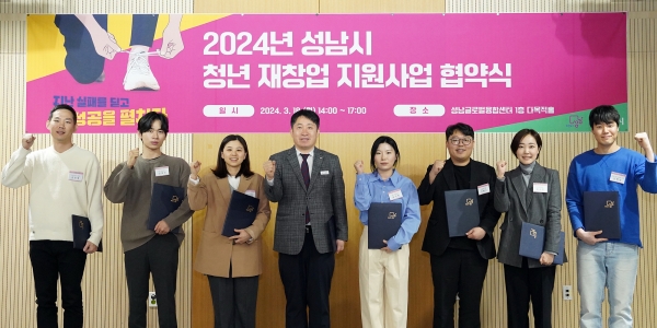 [광성일보] 성남시는 창업에 실패한 경험이 있는 이들을 대상으로 하는 ‘청년 재창업 지원사업’ 참여자 7개 팀(총 13명)을 선발하고, 각 아이템 사업화 지원에 나선다고 18일 밝혔다.시는 이날 오후 2시 성남글로벌융합센터(수정구 달래내로 46) 1층 다목적홀에서 신상진 성남시장과 사업 참여자 등이 참석한 가운데 ‘청년 재창업 지원사업 협약식’을 했다.협약에 따라 7개 팀의 아이템은 연말까지 사업화 또는 고도화를 지원받는다.