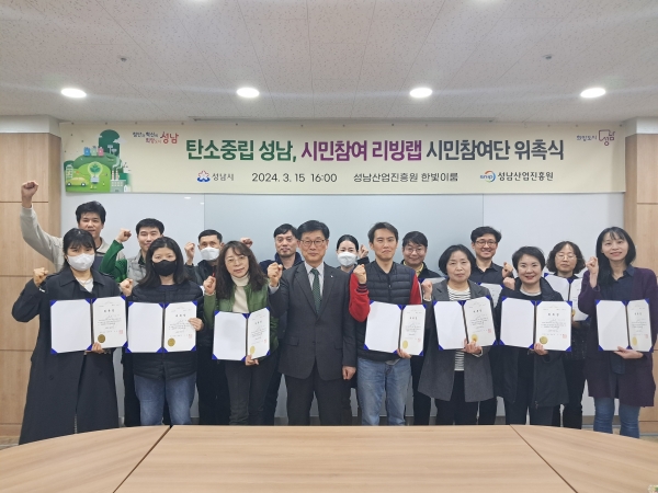 [광성일보] 성남산업진흥원(원장 이의준)은 2024년 ‘탄소중립 성남 시민참여 리빙랩’(이하 시민참여 리빙랩)에 참여할 ‘시민참여단’을 모집하고 위촉식을 개최했다고 18일 밝혔다.‘시민참여단’는 성남시의 직장인, 주부 등 15명으로 구성되었으며, 성남의 도시문제 해결을 위한 아이디어를 제안하고 오는 3월 20일과 3월 27일 두 차례 개최될 시민참여 리빙랩에 참여하게 된다.