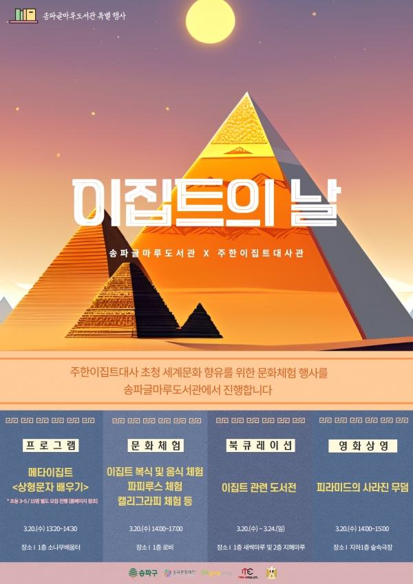 이번 행사에서는 20일 오후 1시 20분부터 오후 5시까지 글마루도서관 곳곳에서 다양한 프로그램이 진행된다.▲이집트 알렉산드리아 대학 소피아 에콜리(Sofia Elkhouly) 교수의 아랍어 문자 조형전 ▲파피루스에 상형문자로 이름 쓰기 ▲전통 차와 간식 등 이집트 음식 체험 ▲이집트 전통 의상 체험 ▲이집트 장신구 및 종이 인형 꾸미기 ▲ 다큐멘터리 <피라미드의 사라진 무덤> 상영 등이다.또한, 고대 이집트 문명 교육앱을 활용해 고대 이집트 문명을 배울 수 있는 <상형문자 배우기: 내가 파라오> 강의도 열린다. 강의는 앱을 개발한 ㈜메타이집트가 진행한다. 고대 이집트 문명에 대한 다양한 교육정보를 게임과 퀴즈를 통해 놀면서 배우고 즐길 수 있다.이 밖에도 송파글마루도서관 1층에서는 오는 20일부터 24일까지 이집트 관련 도서전이 이어진다.