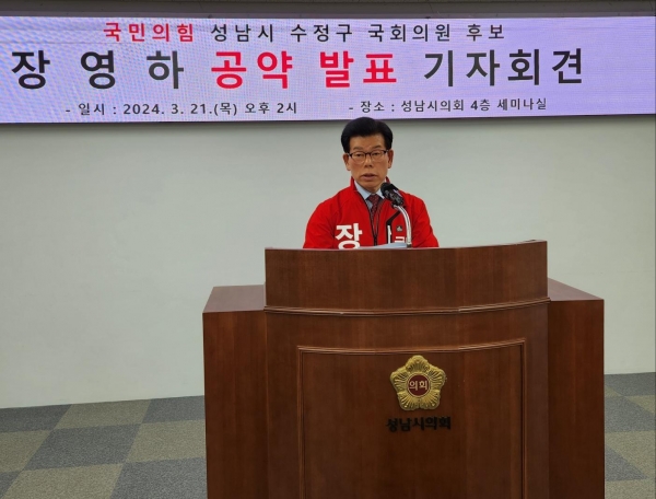 [광성일보] 장영하 국민의힘 수정구 국회의원 후보, 공약발표 기자회견 갖고 수정구의 기분좋은 변화 장영하가 책임지겠습니다!22대 국회의원 선거 국민의힘 수정구 후보 장영하 인사드립니다.유난히 눈이 많았던 겨울이 지나가고 새로운 봄이 찾아왔습니다. 겨우내 움츠렸던 가지에서 새 순이 돋아나고, 곧 봄꽃이 우리 곁을 찾아올 것입니다.자연은 이렇듯 우리에게 새로운 변화를 가져다 주고 있습니다.봄에는 싹이 나고, 여름에는 꽃이 피고, 가을에는 열매를 맺고, 겨울에는 또다시 새로운 생명을 잉태하기 위한 준비를 합니다.그러나 우리 주변의 삶은 그렇지가 못해 안타깝습니다.10년이면 강산도 변한다는데, 수정구는 얼마나 변했습니까?성남시의료원 잘 운영되고 있습니까?주변 상권 얼마나 좋아졌습니까?1공단 근린공원 전면공원화 제대로 했습니까?수 천억원 들인 공원 얼마나 만족하고 계십니까?재개발 과정에서 떠나간 주민들 얼마나 돌아 왔습니까?