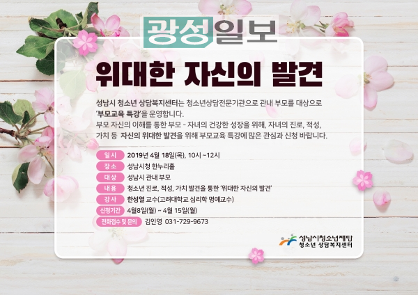 성남시청소년재단 청소년상담복지센터(소장 장인경)는 오는 4월 18일(목), 오전 10시 성남시청 한누리홀에서 고려대 한성열 교수를 초빙하여 2019년 상반기 부모교육 특강을 진행한다.
