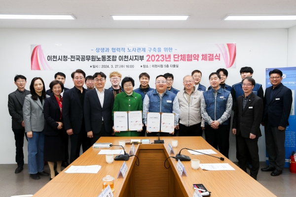 [광성일보] 이천시와 전국공무원노동조합 이천시지부는 3월 27일(수) 이천시청 5층 다올실에서 공무원노조 설립 이래 3번째‘단체협약 체결식’을 가졌다. 이날 체결식에 김경희 이천시장, 이재인 공무원노조 이천시지부장 등 20여명이 참석한 가운데 진행됐다.2023년 7월 31일 이천시지부의 단체교섭 요구안을 접수한 이후 공식, 비공식 접촉 등을 거쳐 노사가 상호 배려와 조정을 통해 3번째 단체협약을 체결하였다. 노사가 2차례 걸쳐 단체협약을 체결하고 이를 이행하는 신뢰가 차곡차곡 쌓아져 가고 있다는 방증이다.