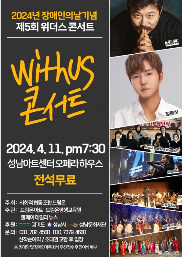 매년 시장과 의회 및 유관기관 관계자들이 함께 참석해 성남시민과 장애인을 격려하고 함께 즐기는 시민 축제로 자리 잡고 있다. 또한 초청 공연으로 성악가 김동규, 빅콰이어, 가수 정동하의 열정 넘치는 음악으로 2024년 새봄을 더욱 행복 넘치는 시간으로 만들고자 한다.2024년 장애인의날기념 '제5회 위더스 콘서트' 기획 공연하는 사회적협동조합 드림온 김서정 대표는 "사회 취약계층에게 사랑과 관심을 가지고 함께 공존하려는 건강한 의식이 우리 사회를 발전적으로 이끄는 힘이 되고, 직업 예술인으로 독립적 사회 구성원으로 자립하려는 장애인들의 의지를 확인하는 뜻 깊은 시간이 되기를 기대한다."고 말했다.공연은 전석무료이며 선착순으로 예약을 받고 있다. 최우선적으로 장애인과 가족에게 우선 예약을 받고 있으며 예약 문의는 사회적협동조합 드림온(031.702 4560)에서 안내 받을 수 있다.