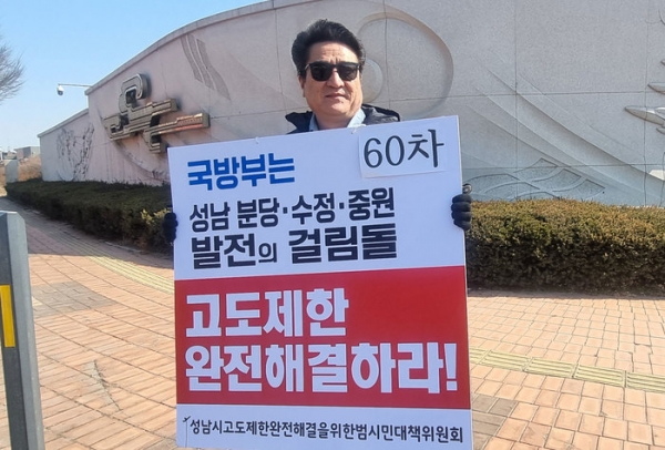 [광성일보] 성남시 고도제한 완전해결을 위한 범시민대책위원회(상임대표 도봉스님, 이하 고도제한범대위)는 고도제한 완전해결을 촉구하며 서울공항 정문 앞에서 진행하고 있는 1인 시위가 지난달 30일로 80차를 넘어섰다고 밝혔다.고도제한범대위는 지난 1월 8일부터 성남시 고도제한이 완전해결 되는 날까지 휴일과 날씨에 상관없이 매일 오전 11시 서울공항 정문 앞에서 진행하고 있다.