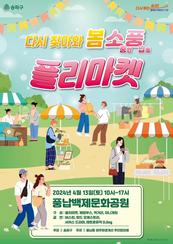송파구와 풍납동 정주환경개선 주민협의체가 주최·주관하며 플리마켓부터 다양한 공연까지 가족과 함께 봄 소풍 가듯 편안하게 즐길 수 있어 큰 호응을 얻고 있다.올해는 오는 13일 10시부터 17시까지 모든 연령층이 함께 할 수 있는 다채로운 자리가 마련된다.▲플리마켓에는 풍납동 주민과 풍납시장 상인회, 전문판매자 등이 참여하여 수공예품, 장난감, 의류, 간식 등을 판매하고 ▲디제잉과 7080라이브, 윈드오케스트라 연주, 서커스드라마도 열린다.▲체험부스에서는 에코백과 부채 만들기, 수막새 문양 와플 만들기, 옛 풍납동 토성을 재현한 MR(혼합현실) 디지털 체험, 플라워 포토존 인생네컷, 레트로 게임 등을 운영한다.