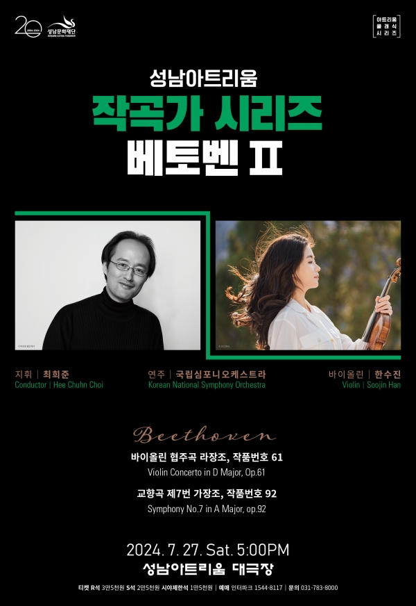 먼저 6월 26일(수) 공연에서는 베토벤의 중기 대표작이자 생애 마지막 피아노 협주곡인 제5번 ‘황제’와 교향곡 제5번 ‘운명’을 들려준다. 공연은 지휘자 이병욱이 이끄는 국립심포니오케스트라가 연주하고, 2022년 프랑스 롱티보 크레스팽 국제피아노콩쿠르 우승자인 피아니스트 이혁이 협연한다.7월 27일(토)에는 바이올리니스트 한수진의 협연으로 베토벤이 작곡한 유일한 바이올린 협주곡 D장조를 연주한다. 이어서 환희와 낙관, 리듬의 역동성이 풍부한 ‘교향곡 제7번’으로 공연의 대미를 장식한다. 공연은 수원시립교향악단 예술감독이자 상임지휘자로 활동 중인 최희준이 지휘봉을 잡는다.성남문화재단 서정림 대표이사는 “올해로 개관 3년 차를 맞이하는 성남아트리움이 클래식 기획 시리즈를 통해 국내외 최고 연주자들의 고품격 무대를 연이어 선보이며 성남 원도심의 문화 랜드마크로 자리매김하고 있다”라며 “앞으로도 다양한 예술 장르의 무대와 지역 예술인들의 활동 기회 확대를 통해 지역 문화예술의 수준 향상에 기여해 나갈 것”이라고 전했다.