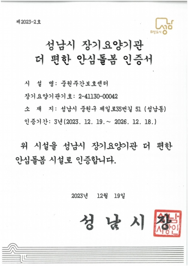 [광성일보] 중원주간보호센터는 성남시가 실시하는 '더 편한 안심 돌봄' 인증에서 2회 연속으로 우수기관으로 선정되었다.성남형 ‘더 편한 안심돌봄’ 인증(이하 성남형 인증) 심사는 경영 · 시설환경 · 맞춤돌봄 · 안심돌봄 · 인권보호 등 총 5개의 영역에 대한 현장평가와 심의 위원회 심사로 평가가 진행되었으며, 우수한 성과와 이용자 만족도를 보인 중원주간보호센터는 2회 연속 인증시설로 차별화된 서비스의 질을 보여주었다.