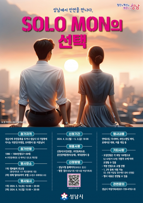 [광성일보] 성남시는 미혼 청춘남녀 결혼 장려 시책의 하나로 지난해에 이어 올해에도 5차례의 ‘솔로몬의 선택’ 행사를 연다고 16일 밝혔다. 솔로몬의 선택은 미혼 남녀에게 자연스러운 만남과 지속적인 관계 발전의 기회를 제공하고, 결혼에 대한 긍정적인 가치관을 확산하기 위한 기획 행사다.우선 1차, 2차 행사 일정이 확정됐다. 첫 행사는 ▲5월 18일 오후 3시~8시 탭퍼블릭 판교점(분당구 백현동) ▲두 번째 행사는 6월 16일 오후 3시~8시 위례 밀리토피아 호텔(수정구 창곡동)에서 각각 열린다. 각각 50쌍(남녀 각 50명)씩 회당 100명이 참여하는 규모다.