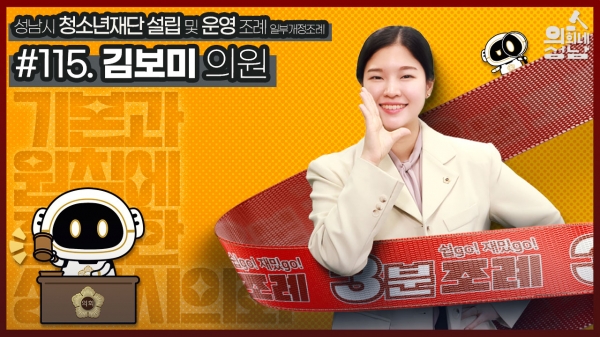 [광성일보] 성남시의회는 ‘3분 조례-김보미 의원 편’ 영상을 시의회 공식 SNS에 게시했다.이번에 소개된 조례는 김보미 의원 등 18명이 발의한 ‘성남시 청소년재단 설립 및 운영 조례 일부개정조례’이다.