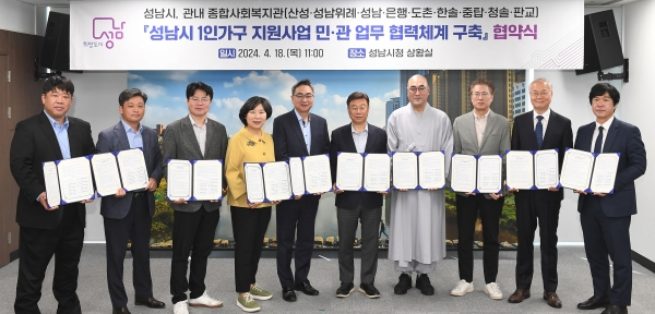 협약 참여 민간기관은 산성종합사회복지관(관장 이순규), 성남위례종합사회복지관(관장 정헌채), 성남종합사회복지관(관장 전영순), 은행종합사회복지관(관장 박진영), 도촌종합사회복지관(관장 이종민), 한솔종합사회복지관(관장 김도윤), 중탑종합사회복지관(관장 강일조), 청솔종합사회복지관(관장 김재일), 판교종합사회복지관(관장 이훈)이다.협약에 따라 이들 기관은 ▲취약계층 1인 가구 발굴 ▲1인 가구 맞춤형 서비스와 안전망 모델 개발 ▲필요시 각 기관 공간 제공과 사업 운영 등에 협력한다.성남시는 1인 가구 지원사업을 총괄하고, 지역 네트워크를 관리·운영한다.신상진 성남시장은 “1인 가구 증가로 고독사, 돌봄 부재, 관계 단절, 고립 등 여러 위험 요소에 대비하는 복지정책이 필요한 시점”이라면서 “공공과 민간기관이 협력해 1인 가구 지원사업을 추진한다면 두텁고 촘촘한 맞춤 복지를 이뤄나갈 수 있을 것”이라고 말했다.