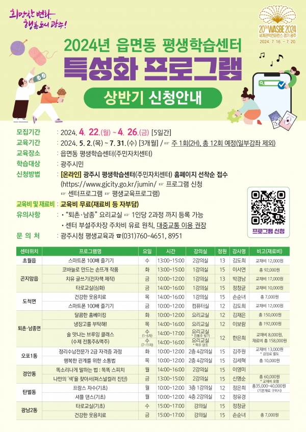 광주시(시장 방세환)는 2024년 상반기 읍면동 평생학습센터, 특성화 프로그램 학습자 모집