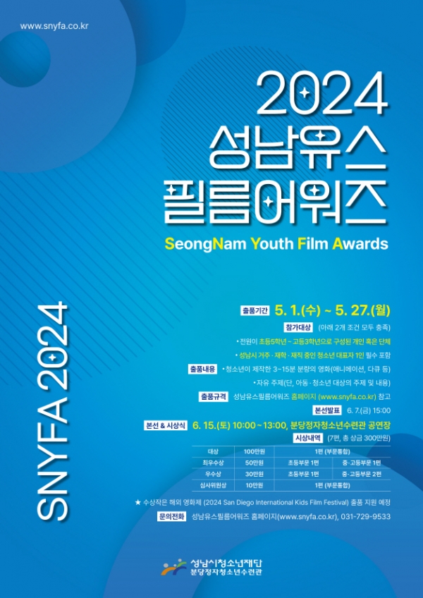 성남시청소년재단 분당정자청소년수련관(관장 서재민)은 5월 1일부터 청소년영화제 성남유스필름어워즈의 출품작을 공모한다.