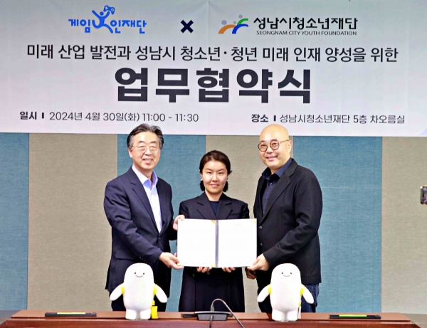 [광성일보] 성남시청소년재단(대표이사 최원기)과 (재)게임인재단(공동이사장 남궁훈, 이나정)은 30일, 미래산업 발전과 성남시 청소년·청년 미래 인재 양성을 위한 업무협약을 체결했다.협약식에는 성남시청소년재단 최원기 대표이사와 (재)게임인재단 남궁훈, 이나정 공동이사장을 포함한 양 재단 관계자가 참석한 가운데 진행되었다.