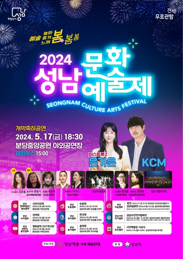[광성일보] (사)한국예총 성남지회(이하 성남예총) 회장 송위혁은 매년 가을에 개최하던 성남문화예술제를 꽃과 만물이 소생하는 봄에 시민들과 함께 문화예술을 향유 할 「제38회 성남문화예술제」‘예술 - 놀아 봄, 즐겨 봄, 느껴 봄’을 테마로 개최한다고 밝혔다.「제38회 성남문화예술제」는 5월 17일(금) 개막축하공연 및 체험 부스 행사를 시작으로 18일(토) 시민가요제, 19일(일) 국악제, 영화음악 OST 콘서트가 본 무대에서 연일 진행될 계획이다.이 밖에도 무용제, 연극제, 음악제, 시민백일장, 사진작가협회전, 미술협회전이 성남아트센터와 성남아트리움에서 펼쳐질 예정이다.