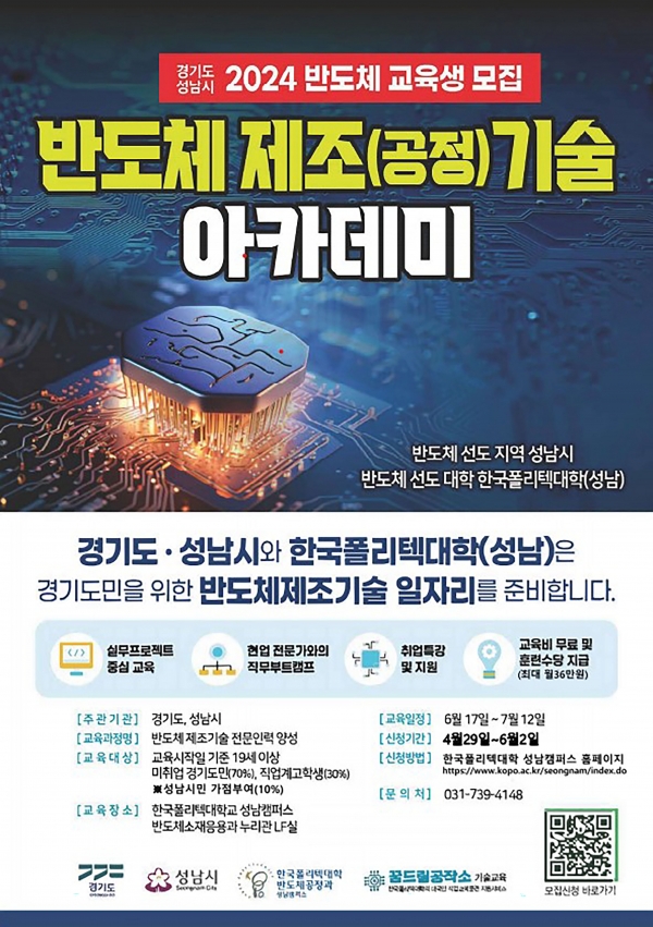 [광성일보] 성남시(시장 신상진)는 반도체 전문 인력양성을 위해 ‘2024년 반도체 제조기술 아카데미’ 교육생 20명을 오는 6월 2일까지 모집한다.성남시와 경기도가 주최하는 ‘반도체 제조기술 아카데미’는 반도체 산업 제조(공정)기술 전문 교육과 취업 연계까지 원스톱으로 지원하는 프로그램이다.교육은 6월 17일부터 7월 12일까지 20일간 수정구 소재 한국폴리텍대학교 성남 캠퍼스에서 진행되며, 경기도에 거주하는 19세 이상 미취업 일반인과 직업계고 졸업(예정)자 중 누구나 지원할 수 있다.