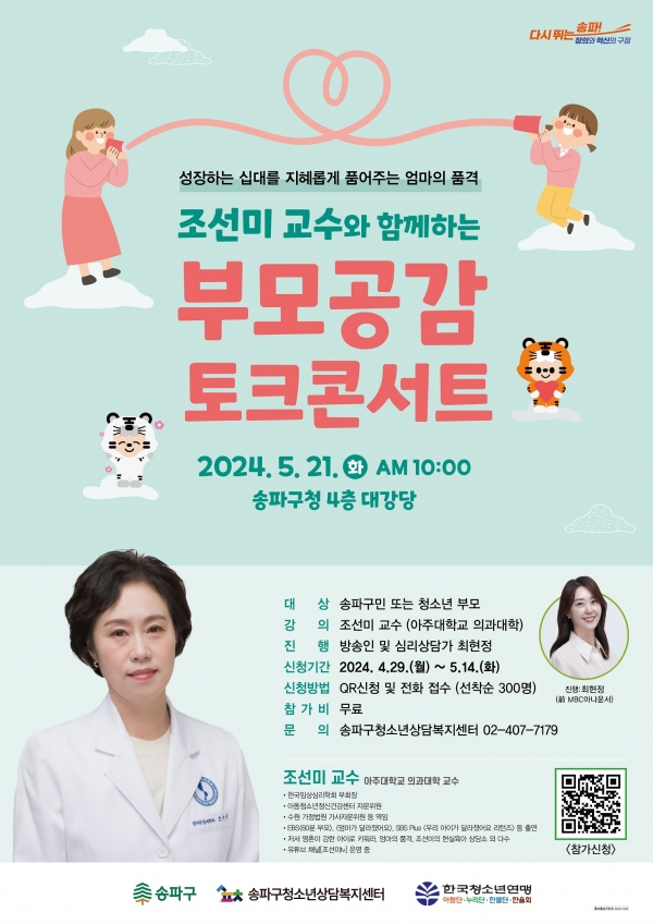 또, 참석한 학부모들과 질의응답 시간을 통해 공감과 소통의 기회를 마련할 예정이다.강연은 청소년기 자녀가 있는 학부모를 대상으로 무료로 진행되며, 참여 신청은 송파구청소년상담복지센터 전화(☎407-7179) 또는 QR코드를 통해 접수하면 된다. 300명 선착순 모집한다.서강석 송파구청장은 “가정의 달을 맞이해 기획한 「부모공감 토크 콘서트」를 통해 자녀들의 마음을 한층 더 이해하고 부모의 양육 능력을 향상시킬 수 있도록 준비했으니, 많은 참여와 관심을 바란다.”고 전했다.