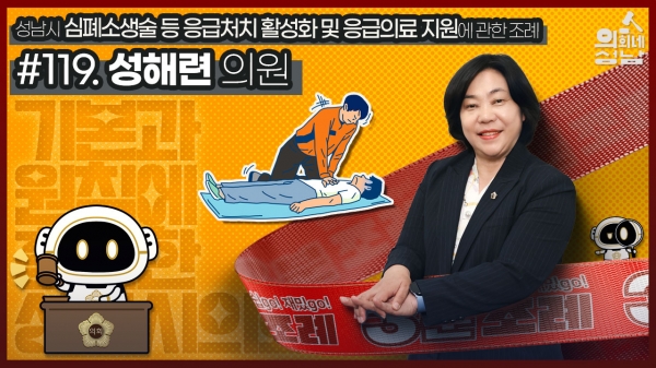 [광성일보] 성남시의회는 ‘3분 조례-성해련 의원 편’ 영상을 시의회 공식 SNS에 게시했다.이번에 소개된 조례는 성해련 의원 등 18명이 발의한 ‘성남시 심폐소생술 등 응급처치 활성화 및 응급의료 지원에 관한 조례’다.
