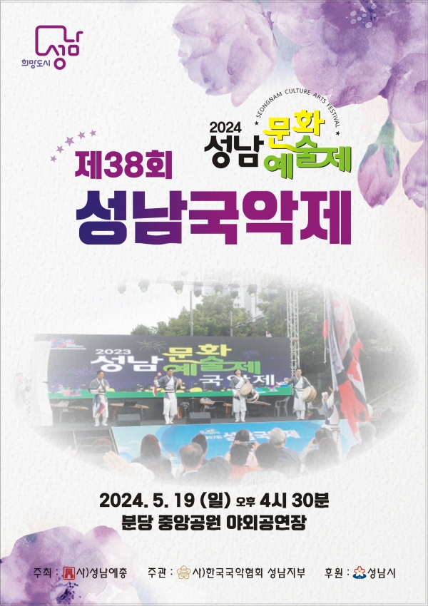[광성일보] (사)한국국악협회 성남시지부(지부장 이향우)가 주관하고, 성남예총(회장 송위혁) 주최, 성남시가 후원하는 ‘제38회 성남국악제’가, 5.19(일) 오후 4시 30분, 분당중앙공원 야외공연장에서 열린다.