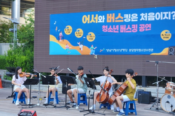 [광성일보] 성남시청소년재단 분당정자청소년수련관(관장 서재민)은 지난 18일, 정자역 광장에서 청소년 버스킹 공연 ‘어서와, 버스킹 처음이지?’를 개최했다.버스킹 공연에는 청소년 현악 동아리 ‘하이파이브’의 합주 공연을 시작으로 수내고 밴드 동아리 ‘데시벨’ 등 청소년 밴드 4팀의 라이브 공연을 선보여 많은 청소년과 시민들의 호응을 얻었다.