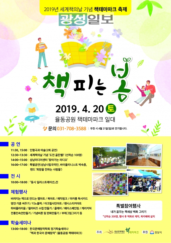우천이나 미세먼지 등 야외행사가 어려울 때는 21일(일)로 하루 연기해 진행하고, 실내 전시 및 학술세미나는 예정대로 진행된다. 기타 행사 관련 문의는 성남문화재단 책테마파크 (031-708-3588)로 하면 된다.