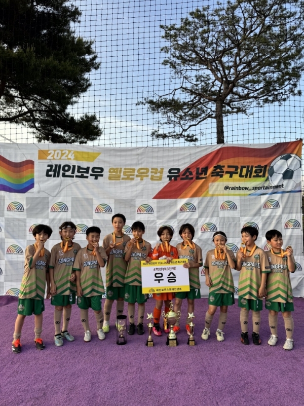 [광성일보] 송파구(구청장 서강석)가 2021년 축구 꿈나무 육성을 위해 창단한 ‘송파구 유소년축구단’이 지난 19일 경기도 안산에서 열린 ‘2024 레인보우 옐로우컵 유소년축구대회’에서 4학년부 부문 우승을 차지했다고 알렸다.송파구 유소년축구단은 4학년부터 6학년까지 총 30명으로 구성된 구립 축구단이다. 양질의 수업과 함께 수업료, 운동복, 대회 참가비 등을 구가 전폭적으로 지원하고 있어 학부모들의 입단문의가 수시로 빗발칠 정도로 인기다. 전문감독과 코치 2인 체제하에 매주 3~4일 2시간씩 연습하고 있다.