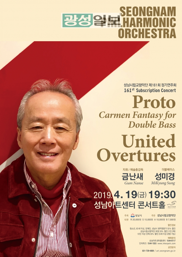 성남시(시장 은수미)의 자랑인 성남시립교향악단의 161회 정기연주회가 오는 2019년 4월 19일 금요일 오후 7시 30분 성남아트센터 콘서트홀에서 개최된다.금난새 지휘자가 지휘를 맡는 이번 연주회는 프로토의 카르멘 환상곡과 4개의 서곡 시리즈를 연주한다.