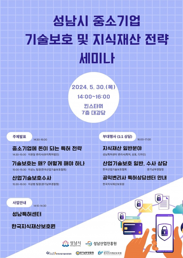 [광성일보] 성남시는 오는 5월 30일 오후 2시 킨스타워 7층 대강당에서 ‘중소기업 기술보호 및 지식재산 전략 세미나’를 개최한다.성남산업진흥원, 한국산업기술보호협회, 경기남부경찰청과 공동으로 개최하는 이번 세미나는 중소기업이 꼭 알아야 할 기술보호 관련 핵심 내용들과 지식재산 전략 관련 내용을 소개한다.