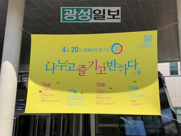 성남시(시장 은수미)는 장애인의 날인 오는 4월 20일까지 기관·단체별로 다양한 주제의 장애인 주간행사를 진행한다.성남시 율동생태학습원의 ‘해피투게더’, 한마음복지관의 ‘나누고 즐기고 반하다’, 한국장애인문화협회 성남시지부의 ‘위더스 with us 콘서트’, 성남시장애인연합회의 제39회 장애인의 날 기념행사 등이다.