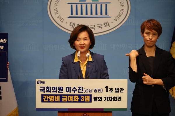 성남시 중원구 더불어민주당 이수진 의원이 30일, 국회 소통관에서 22대 국회 제1호 법안 ‘간병비 급여화 3법’ 발의 기자회견을 가졌다.
