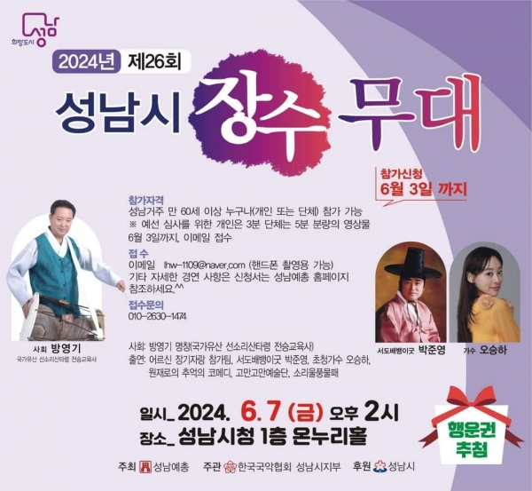 [광성일보] 성남시 어르신들의 한마당 축제인 ‘제26회 성남시 장수무대’가 6. 7(금)오후2시부터 성남시청 1층 온누리홀에서 한국국악협회 성남시지부(지부장 이향우)주관, 성남예총(회장 송위혁) 주최로 펼쳐진다.