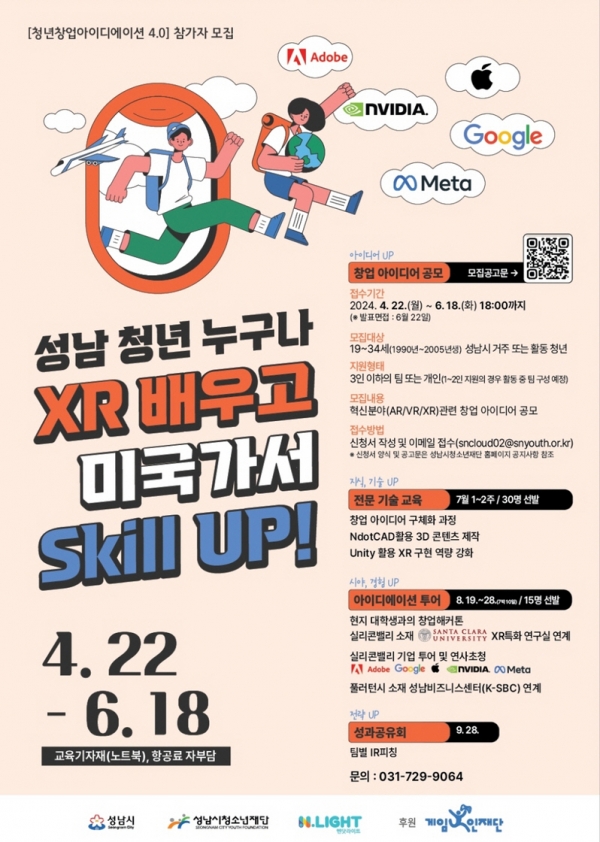 [광성일보] 성남시청소년재단(대표이사 최원기)과 3D 콘텐츠 기술 기업 엔닷라이트(대표 박진영)가 청년들의 글로벌 기술 분야 창업 역량 강화를 위한 “청년 창업 아이디에이션 4.0” 프로젝트의 참가팀을 모집한다.“청년 창업 아이디에이션 4.0”은 XR 기술 분야 창업을 희망하는 청년에게 교육, XR 개발 해커톤, 미서부 실리콘밸리 현직자와의 만남 등의 경험을 제공하여 수준 높은 창업 아이디어를 현실화하는 일련의 과정을 지원한다.