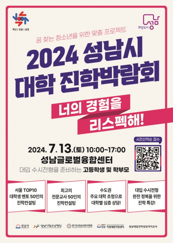박람회에는 50명의 대학입학전문 상담교사가 전형 분야별 맞춤형 상담을 제공하고, 수시전형으로 대학에 입학한 서울 Top10 대학의 재학생 50명이 상담멘토로 나서 수시전형의 노하우를 전수한다.아울러 학생부 종합 전형과 논술 전형 등 대학 입학에 필요한 진학특강이 진행되며, 수도권 16개 주요 대학이 참여해 대학 진학과 학과 정보에 대한 자세한 상담을 받을 수 있다.박람회는 오는 6월 7일부터 성남시청소년재단 홈페이지 또는 포스터의 qr코드를 통해 신청할 수 있다.
