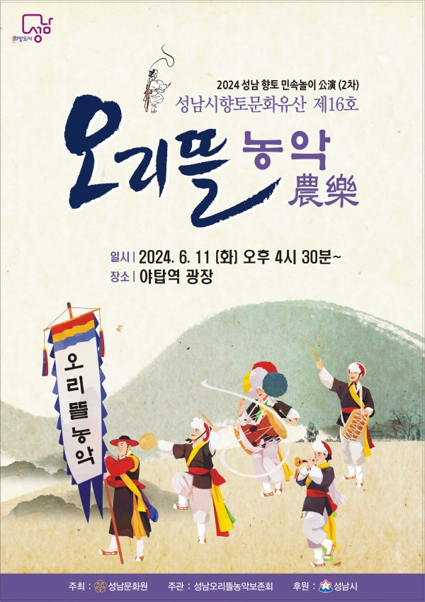 [광성일보] 성남문화원(원장 김대진) 주최, 성남오리뜰농악보존회 주관, 성남시가 후원하는 향토민속놀이 ‘성남 오리뜰농악’ 공연이, 6. 11(화) 오후 4시 30분 야탑역 광장에서 개최된다.