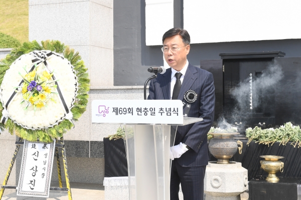 [광성일보] 신상진 성남시장은 6일 수정구 태평동 현충탑에서 열린 제69회 현충일 추념식에 참석했다.신 시장은 추념사를 통해 “개인의 일신과 평안보다 나라를 위해 헌신한 순국선열과 호국영령들의 영전에 애도를 표한다”면서 “선열들의 숭고한 희생정신을 가슴 깊이 새기며, 후손들은 명예와 긍지를 갖고 살아갈 수 있도록 최고의 예우로 보답하겠다”라고 말했다.